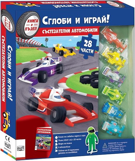 Подредете пъзела от 28 части и ще получите състезателна писта за игра с размери 42 x 61 cm. Вече може да се състезавате с вашите 6 коли. Издърпайте автомобила назад и го пуснете - той ще тръгне напред! Извадете детайлите от картоненото приложение и сглобете човешки фигури, конуси, знамена и бариери, с които да оживите пистата. В книгата ще намерите забавни тематични задачи и игри - лабиринти, намиране на разлики и липсващи детайли, рисуване и много други.Комплектът съдържа: