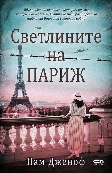 Лондон, 1953 г. Луиз все още живее с кошмарните спомени от войната, когато сред непотребни вещи втора употреба открива златно колие с разполовено сърце. Колието е в касетка с логото на магазин в Париж и тя е сигурна, че го е виждала преди години, в окупираната от нацистите Европа. Златната верижка не е просто спомен, тя е ключът към мистериозната смърт на приятелката ѝ Франи, загинала по време на войната. Измъчвана от въпроси, Луиз е твърдо решена да разплете загадката на колието. Това, което не подозира, е, че дори десетилетие по-късно все още има сили, готови на всичко, за да я спрат.Вдъхновен от истинската история на магазин Левитан, Светлините на Париж е незабравим роман за саможертвата, смелостта и силата на любовта да осветява дори най-тъмните дни.След "Жената със синята звезда" и "Кодово име Сапфир, Пам Дженоф отново се завръща към времето на Втората световна война, за да поведе читателя на пътешествие назад към разтърсващите тайни на миналото и навътре към дълбоките трепети на човешкото сърце.