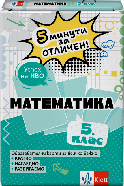 Успех на Национално външно оценяване.Комплектът съдържа 32 образователни карти, обхващащи най-важния материал по математика за 5клас- кратко, нагледно, разбираемо. Част е от учебно-помощната система 5 минути за отличен на издателство Клет България за бързо и лесно усвояване, затвърдяване и преговор на наученото, както и в подготовката за изпити и тестове.Картите са с размери 21 x 14.8 cm.
