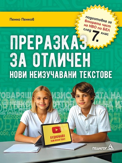 Книгата е сборник от текстове, които отговарят на изискванията на МОН за втората част на изпита за национално външно оценяване по БЕЛ след 7. клас. Заедно с методическите указания и примерните критерии за оценка, към двата типа трансформиращ преразказ са предложени и ученически преразкази, оценени за отличен.Представени са и 25 текста за преразказване, като: