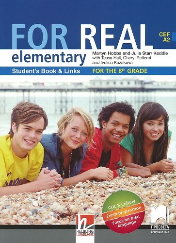 For real e гъвкава система по английски език, адаптирана за потребностите на българските ученици. Тя развива интегрирано четирите езикови умения чрез близки до интересите на ученика текстове и сюжети, свързани с реалния живот на младите хора във Великобритания и запознава учениците с богатството от изразни средства на съвременния език и успешно свързва овладяването на граматичния материал с изграждането на комуникативни умения. Също така подготвя учениците за изпитите на Кеймбридж (PET, KET, FCE) и Тринити и отваря пред тях вратите на англоговорещия свят.Учебникът съдържа и уроци за България, за да могат учениците да разкажат със самочувствие на чуждия език за културата, природата, историята, традициите и обичаите на родината си.Учебникът For Real - Ниво Elementary (А2) предлага: